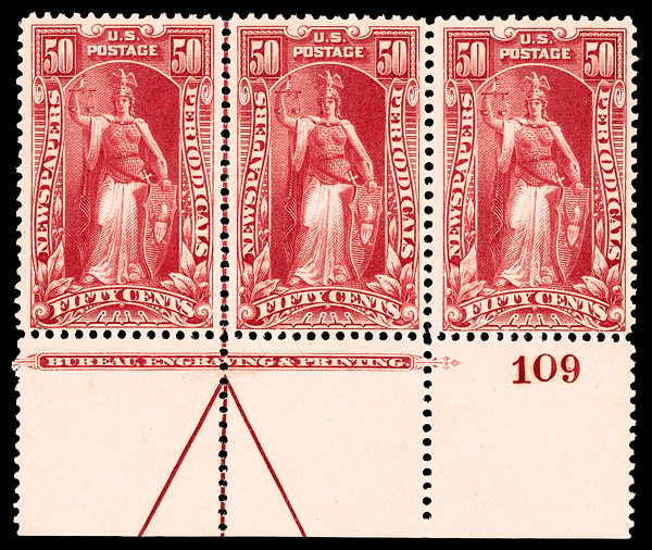 5448 og PR119 imageNewspaper, 1895, 50¢ lilac rose, Bureau printing, D.L. watermark (Scott PR119), plate number strip of 3, o.g., hinged, Fine to Very Fine.