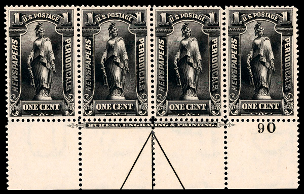 5445 og PR114 imageNewspaper, 1896, 1¢ black, Bureau printing, D.L. watermark (Scott PR114), plate number strip of 4, o.g., hinge remnant, Very Fine.