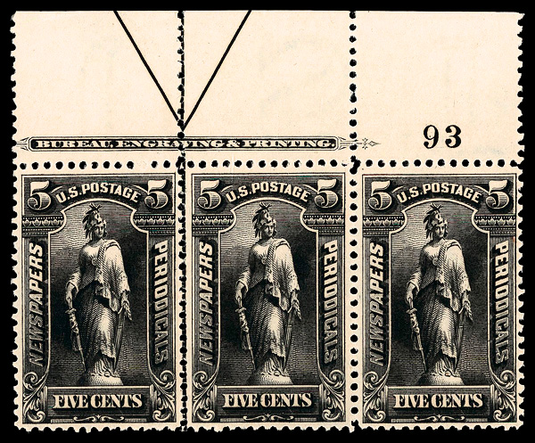 5446 og PR116 imageNewspaper, 1896, 5¢ black, Bureau printing, D.L. watermark (Scott PR116), plate number strip of 3, o.g., lightly hinged, Fine to Very Fine.