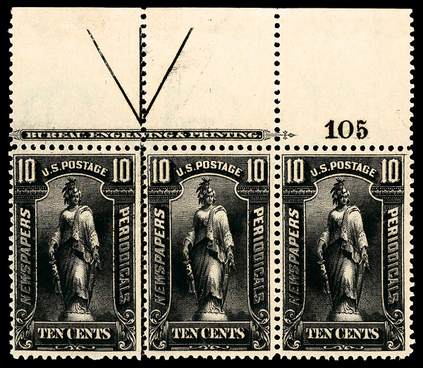 5447 og PR117 imageNewspaper, 1895, 10¢ black, Bureau printing, D.L. watermark (Scott PR117), plate number strip of 3, o.g., lightly hinged, Fine.