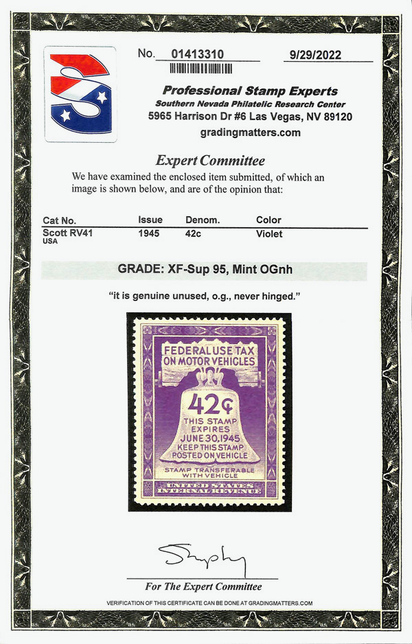 5477 nh RV41 imageMotor Vehicle Use, 1945, 42¢ violet (Scott RV41), o.g., never hinged, Extremely Fine to Superb, with 2022 P.S.E. certificate graded XF-SUP 95. (Image) (Image2) (All Images)