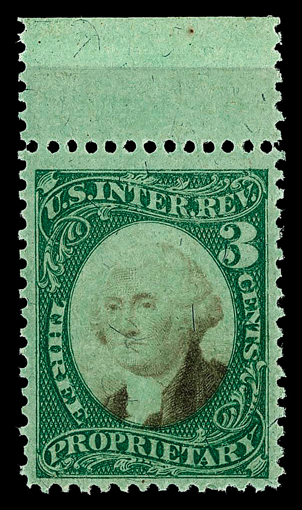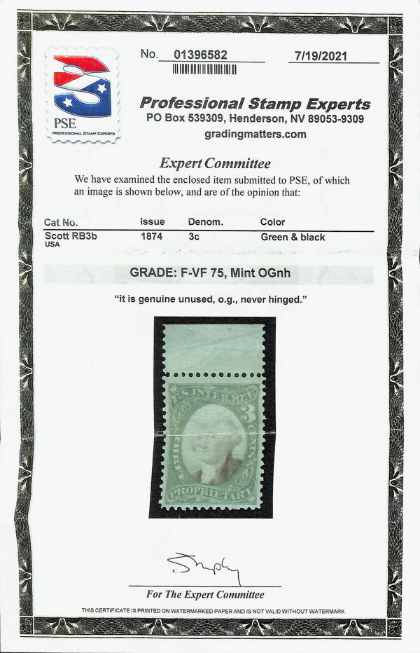 5466 nh RB3b imageProprietary, 1874, 3¢ green & black, green paper (Scott RB3b), o.g., never hinged, Fine to Very Fine, with 2021 P.S.E. certificate graded F-VF 75.