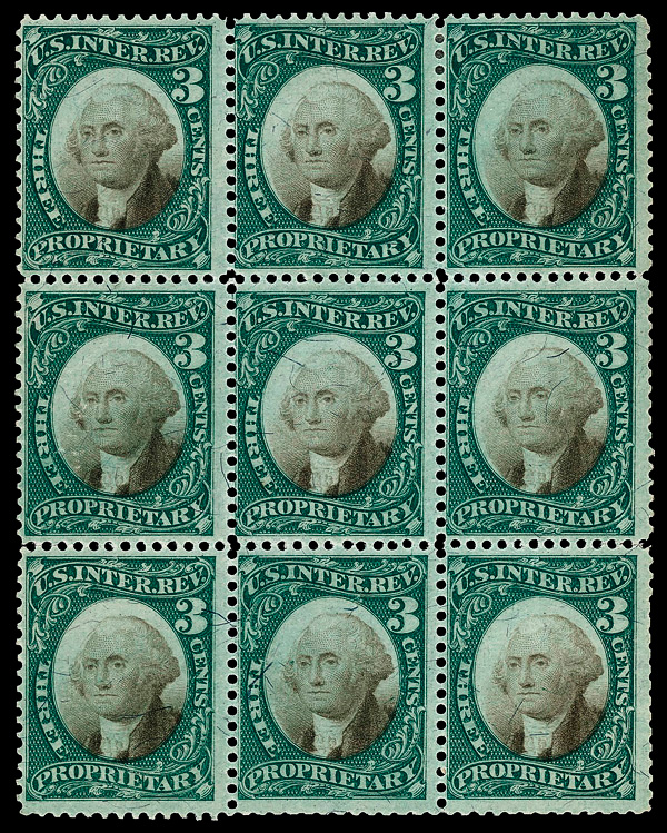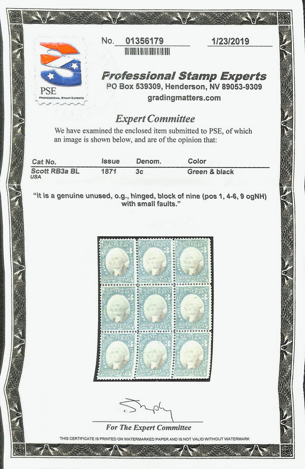 5465 nh/ogbl RB3a imageProprietary, 1871, 3¢ green & black, violet paper (Scott RB3a), block of 9, o.g., hinge remnant (5 stamps never hinged); some with minor faults, Fine to Very Fine, with 2019 P.S.E. certificate.