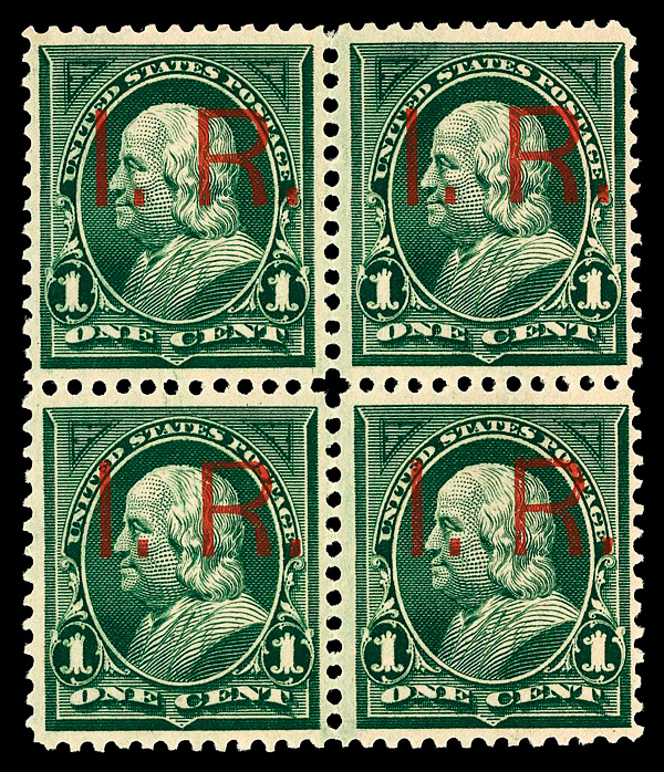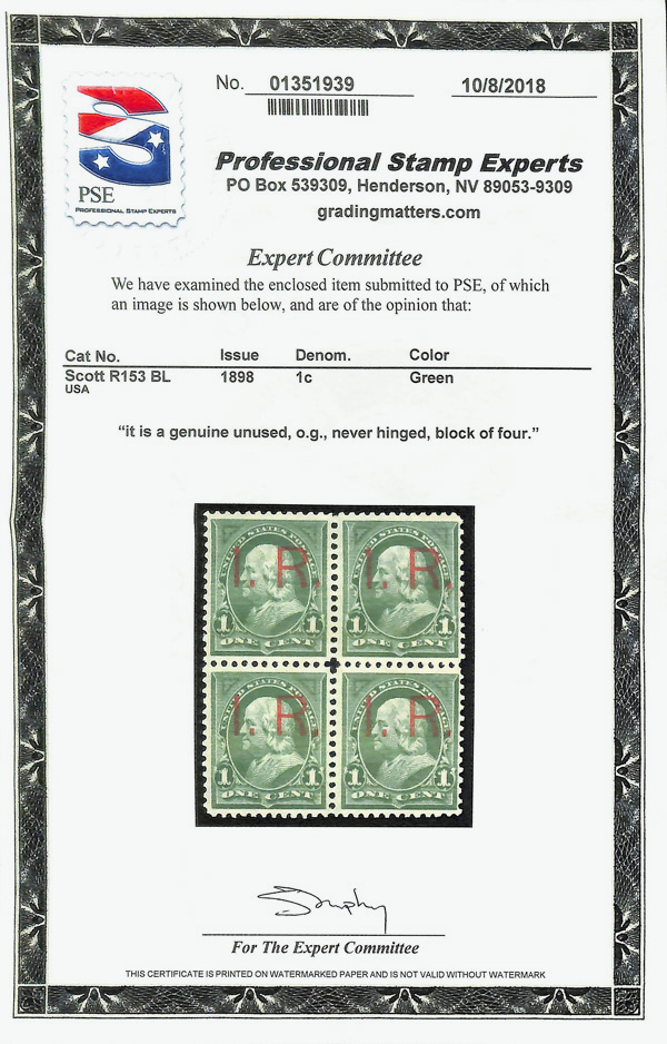 5460 nhbl R153 imageDocumentary, 1898, "I.R." provisional, 1¢ green, rectangular periods (Scott R153), block of 4, o.g., never hinged, Very Fine, with 2018 P.S.E. certificate. (Image) (Image2) (All Images)