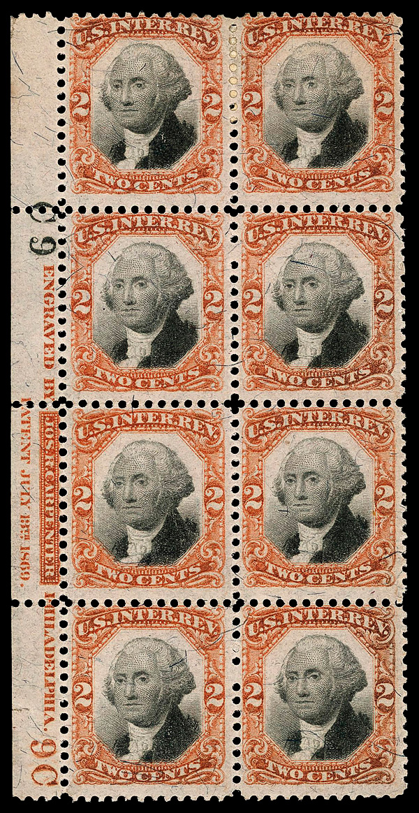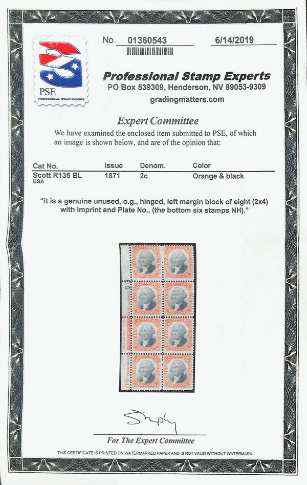 5459 nh/ogbl R135 imageDocumentary, 1871, Third Issue, 2¢ orange & black (Scott R135), plate block of 8, o.g., paper hinge remnant (6 stamps never hinged), Fine, with 2019 P.S.E. certificate. (Image) (Image2) (All Images)