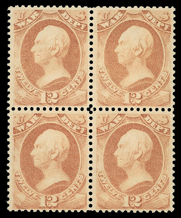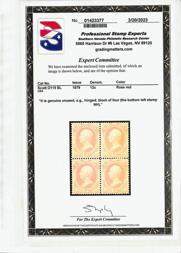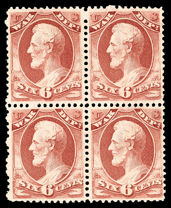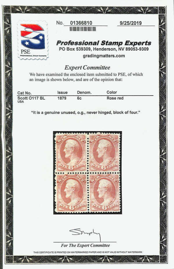 5442 nhbl O117 imageWar Dept., 1879, 6¢ rose red (Scott O117), block of 4, o.g., never hinged, Fine to Very Fine, with 2019 P.S.E. certificate.