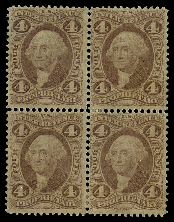 5456 ogbl R22c imageRevenue, 1862, First Issue, 4¢ Proprietary, perf'd (Scott R22c), block of 4, o.g., hinge remnants, Fine.