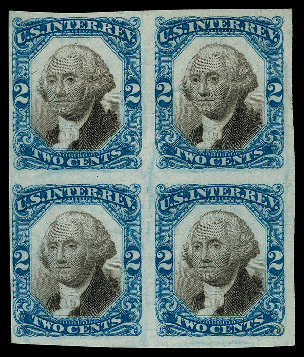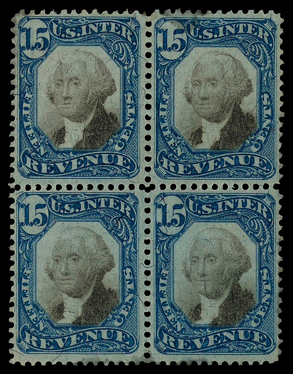 5458 ogbl R110 imageDocumentary, 1871, Second Issue, 15¢ blue & black (Scott R110), block of 4, disturbed o.g.; minor faults, Fine to Very Fine.
