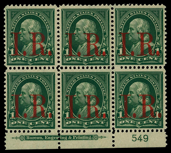 5461 nhbl R154 imageDocumentary, 1898, "I.R." provisional, 1¢ green, square periods (Scott R154), plate block of 6, small period after 'I' variety middle bottom stamp, o.g., never hinged, Fine to Very Fine.