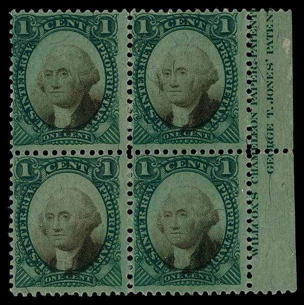 5464 ngbl RB1b imageProprietary, 1874, 1¢ green & black, green paper (Scott RB1b), right margin block of 4 with part imprint, unused without gum, Fine.