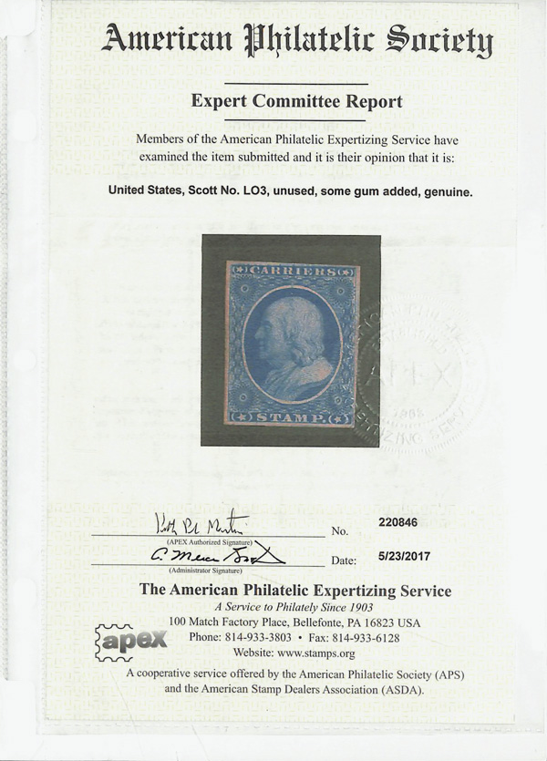 5453 ng LO3 imageCarrier, 1875 (1¢) Franklin, Reprint (Scott LO3), without gum as issued, with some added gum, Very Fine, with 2017 A.P.E.X. certificate.