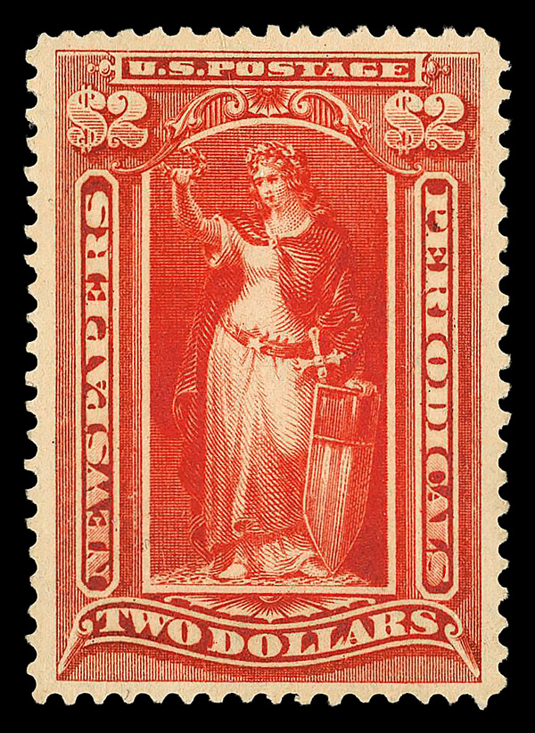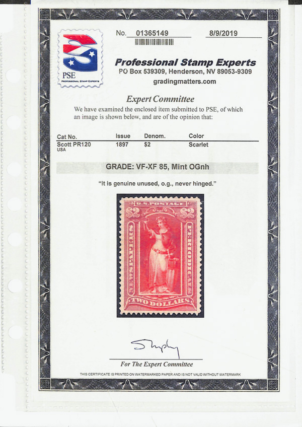 5449 nh PR120 imageNewspaper, 1897, $2 scarlet, Bureau printing, D.L. watermark (Scott PR120), o.g., never hinged, Very Fine to Extremely Fine, with 2019 P.S.E. certificate graded VF-XF 85.