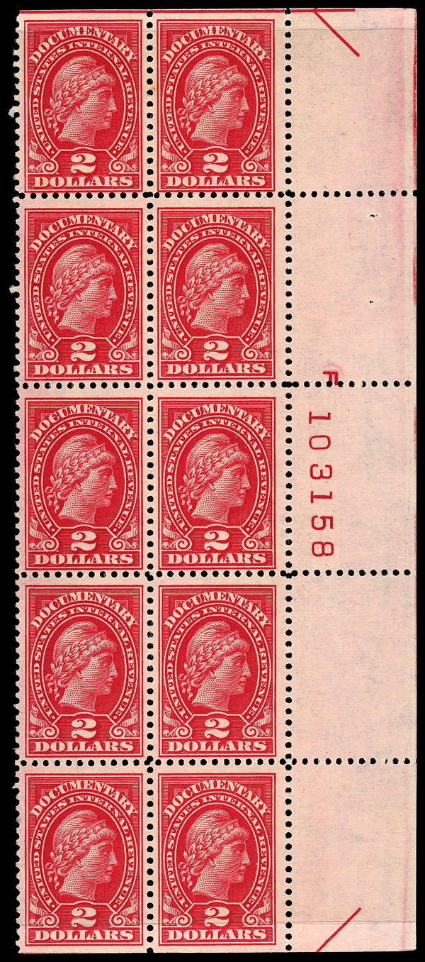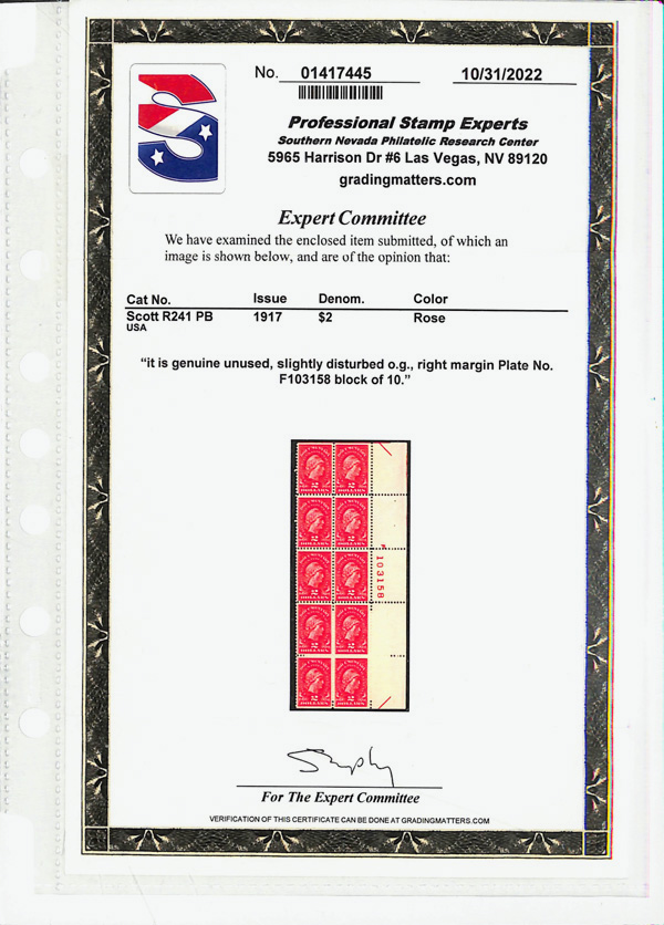 5462 nh/ogbl R241 imageDocumentary, 1917, $2 Liberty (Scott R241), plate block of 10, o.g., slightly disturbed gum (8 stamps never hinged), Fine to Very Fine, with 2022 P.S.E. certificate.
