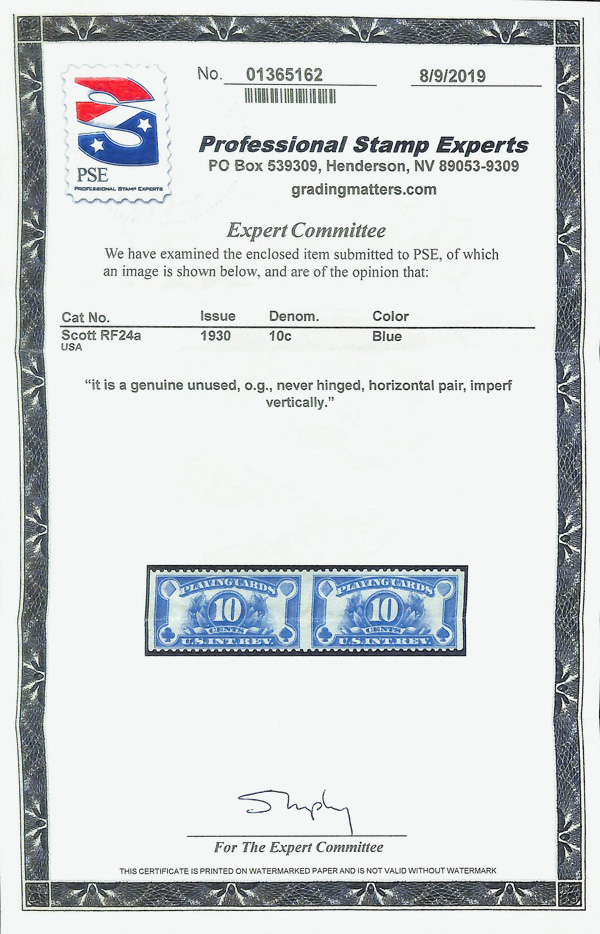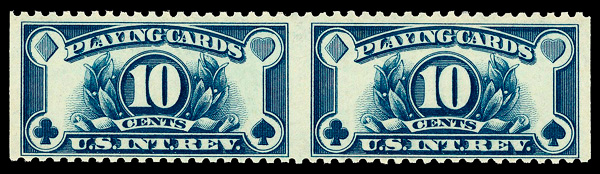 5471 nh RF24a imagePlaying Cards, 1930, 10¢ blue, imperf vertically (Scott RF24a), horizontal pair, o.g., never hinged, Fine, with 2019 P.S.E. certificate.