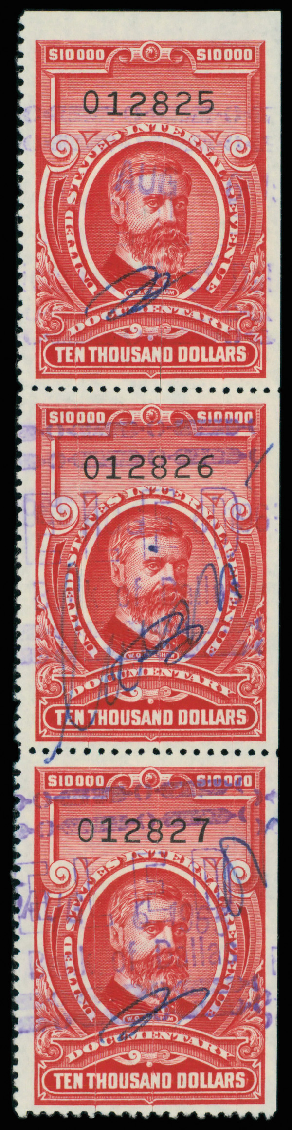 5463 O R732 imageDocumentary, 1958, $10,000 Gresham (Scott R732), strip of 3, cut cancel, Very Fine to Extremely Fine.