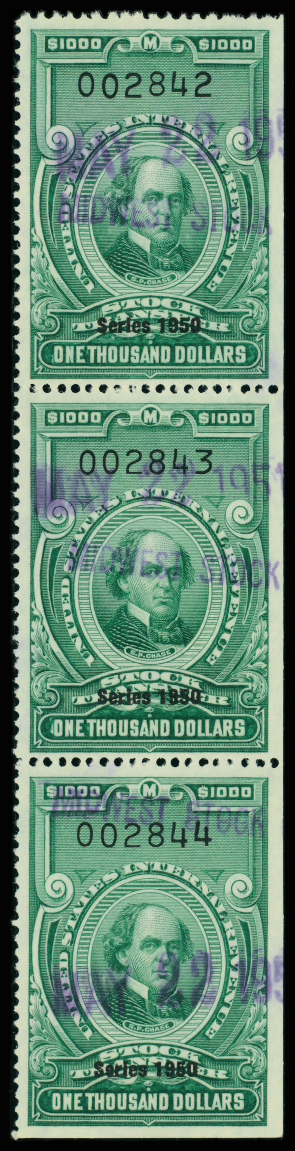 5469 O RD335 imageStock Transfer, 1950, $1,000 Chase (Scott RD335), vertical strip of 3, Fine to Very Fine.