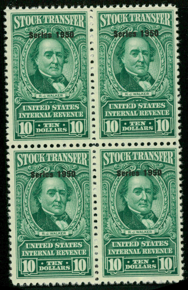 5467 ngbl RD328 imageStock Transfer, 1950, $10 Walker (Scott RD328), block of 4, unused without gum, Very Fine.