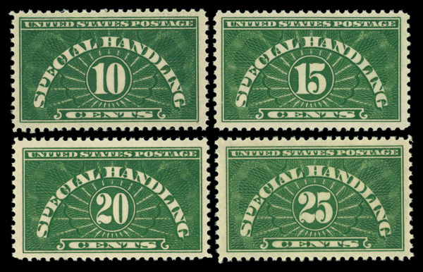 5450 nh QE1-QE4 imageSpecial Handling, 1925-28, 10¢ to 25¢ complete (Scott QE1-QE4), o.g., never hinged, Extremely Fine.