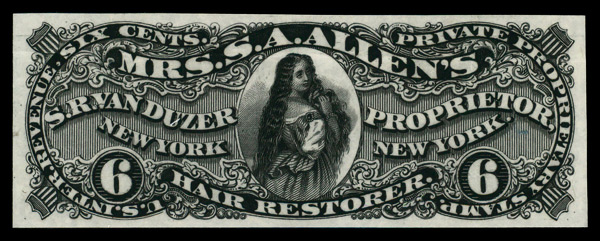 5476 P RS250P3 imageVan Duzer, S.R., 6¢ black, plate proof on India (Scott RS250P3), without gum as issued; crease, Very Fine.