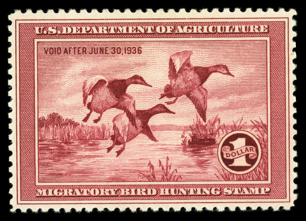 5479 og RW2 imageFederal Duck Stamp, 1935, $1 Canvasbacks (Scott RW2), o.g., very lightly hinged; reperfed at left, Fine to Very Fine.