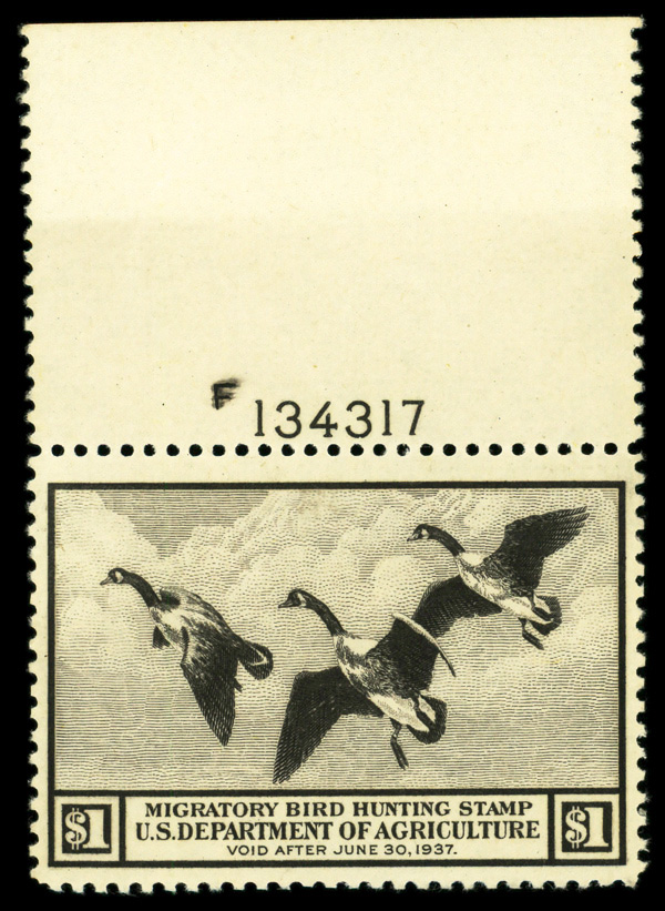 5480 nh RW3 imageFederal Duck Stamp, 1936, $1 Canada Geese (Scott RW3), plate number single, o.g., never hinged, Very Fine to Extremely Fine.