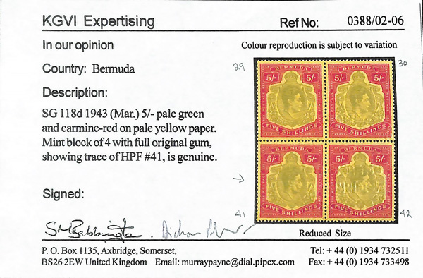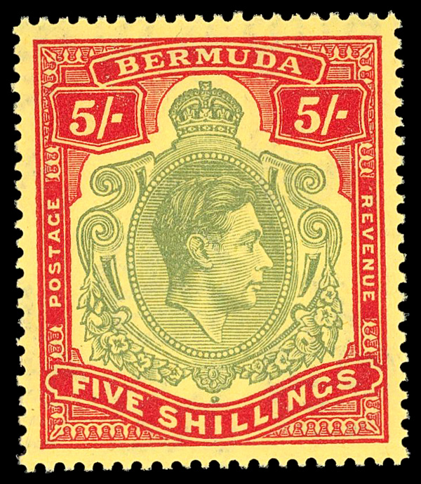 5629 nh 125a var. image1943, King George VI, 5s pale bluish green & carmine red on pale yellow, perf. 14, ordinary paper (Scott 125a var.), o.g., never hinged, Extremely Fine to Superb, with photocopy of 2026 KGVI Expertising certificate.
