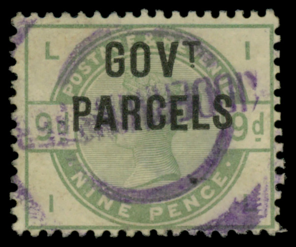 5614 O O29 imageGovt. Parcels, 1883, Queen Victoria, 9d dull green (Scott O29), Fine.