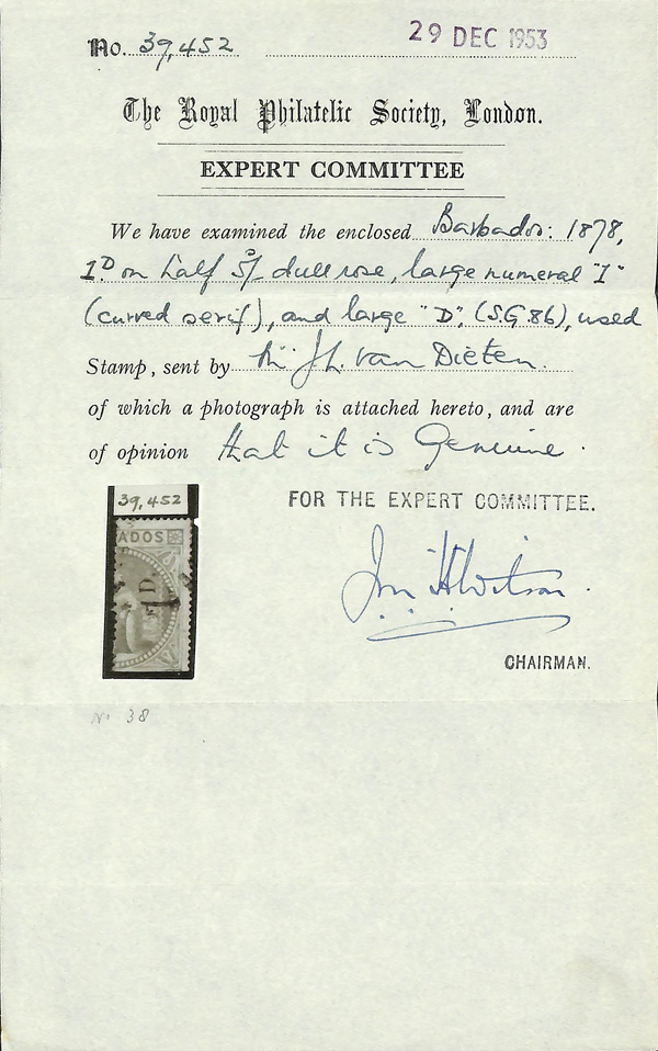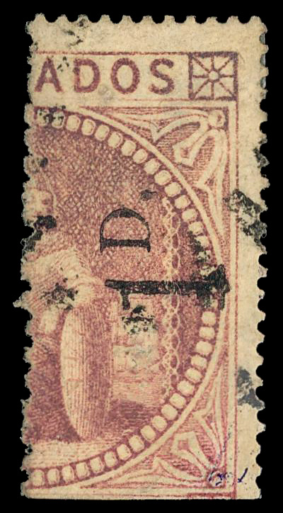 5627 O 57 image1878, "Britannia", 1d on half of 5s dull mauve, curved serif on "1" (Scott 57), Fine to Very Fine, with 1953 R.P.S.C. certificate.