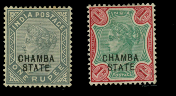 5644 og 10-11 image1887-95, India 1r gray & 1r carmine rose & green, 'CHAMBA/STATE' overprint (Scott 10-11), o.g., hinge remnants, Very Fine.