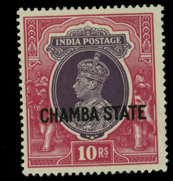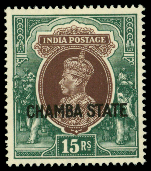5646 og 86 image1938, India 15r dark green & dark brown 'CHAMBA/STATE' overprint (Scott 86), o.g., hinge remnant, Very Fine to Extremely Fine.