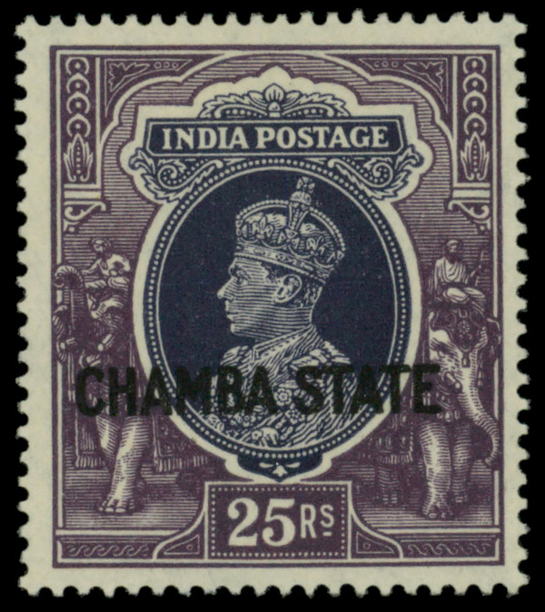 5647 og 87 image1938, India 25r dark violet & blue violet 'CHAMBA/STATE' overprint (Scott 87), o.g., hinge remnant, Very Fine.