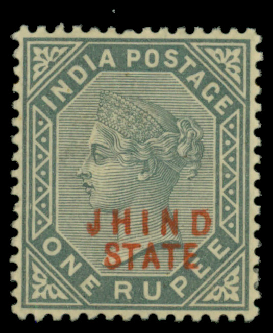 5649 og 43 image1885, India 1r gray, red 'JHIND/STATE' overprint (Scott 43), o.g., lightly hinged, Extremely Fine.