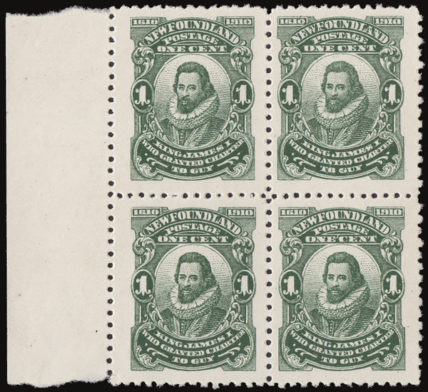 5662 nhbl 87 & vars. image1910, 1¢ Guy Tercentenary, perf 12 x 11, normal & three varieties (Scott 87 & vars.), a choice left sheet margin block of 4, positions 41-42/51-52; the upper left stamp "NFW," upper right "JAMRS," lower left normal, lower right "ONE'CENT", o.g., never hinged, post office fresh and beautifully centered, Extremely Fine.