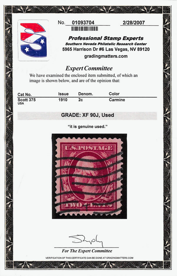 5104 O 375 image1910, 2¢ carmine, S.L. watermark (Scott 375), Extremely Fine, with 2007 P.S.E. certificate graded XF 90J.