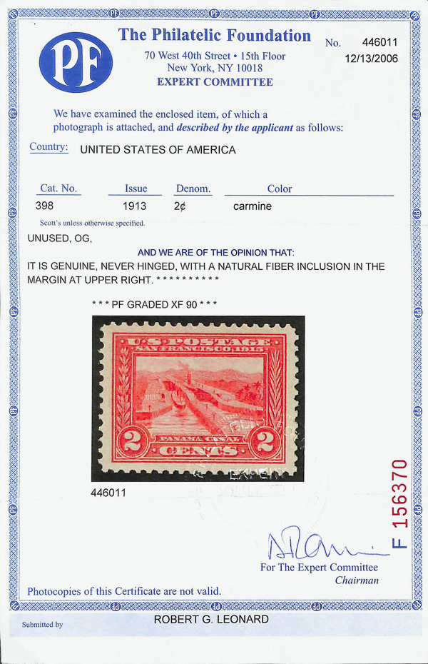 5107 nh 398 image1913, 2¢ Panama-Pacific, perf. 12 (Scott 398), o.g., never hinged (paper inclusion), Extremely Fine, with 2006 P.F. certificate graded XF 90.