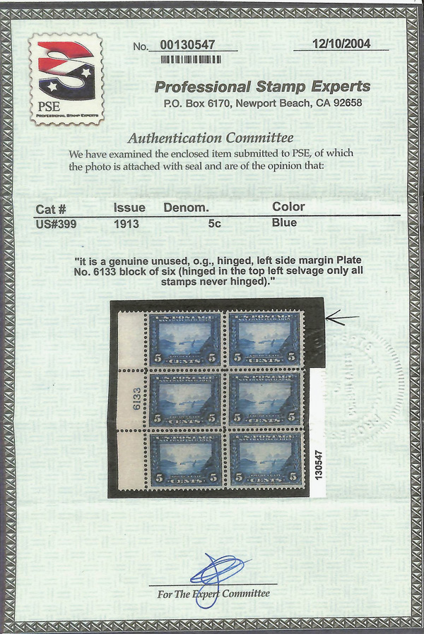5108 nh 399 image1913, 5¢ Panama-Pacific, perf. 12 (Scott 399), o.g., never hinged, Very Fine, with photocopy of 2004 P.S.E. certificate for block of which is the UR stamp.