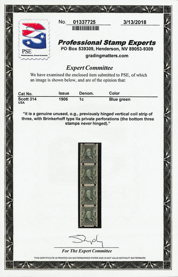 5083 nh/og 314 image1906, 1¢ blue green, imperf. (Scott 314), strip of 4, Brinkerhoff type IIa private vending perfs, o.g., lightly hinged (3 stamps never hinged), Very Fine, with 2018 P.S.E. certificate.