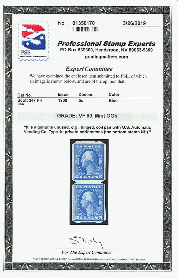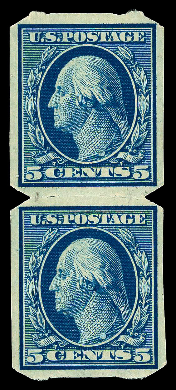 5095 og 347 image1909, 5¢ blue, D.L. watermark, imperf. (Scott 347), pair, U.S. Automatic Vending Co. Type Ia private vending perfs, o.g., hinge remnant (pencil mark on gum), Very Fine, with 2019 P.S.E. certificate.