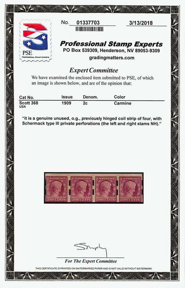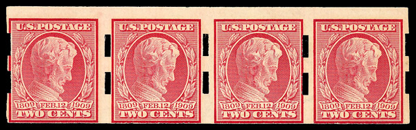 5097 og 368 image1909, 2¢ Lincoln Centenary, imperf. (Scott 368), strip of 4 (3mm spacing), Schermack Type III private vending perfs, o.g., hinged, Very Good to Fine, with 2018 P.S.E. certificate.