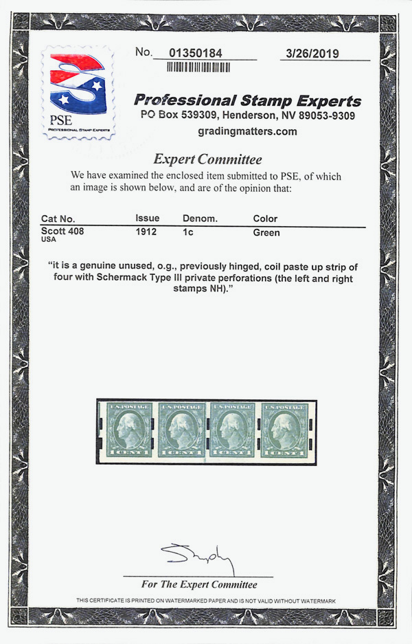 5111 nh/og 408 image1912, 1¢ green, S.L. watermark, imperf. (Scott 408), paste up strip of 4, Schermack Type III private vending perfs, o.g., lightly hinged (2 stamps never hinged), Fine, with 2019 P.S.E. certificate.