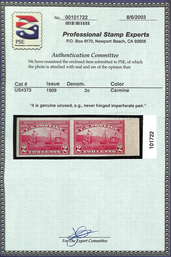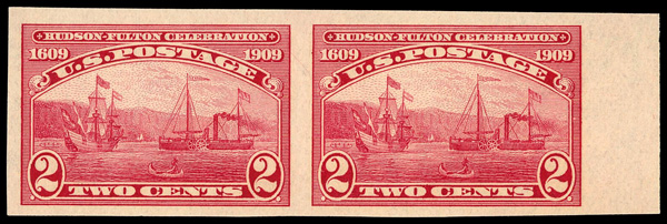 5101 nh 373 image1909, 2¢ Hudson-Fulton, imperf. (Scott 373), right margin horizontal pair, o.g., never hinged, Very Fine, with 2003 P.S.E. certificate.