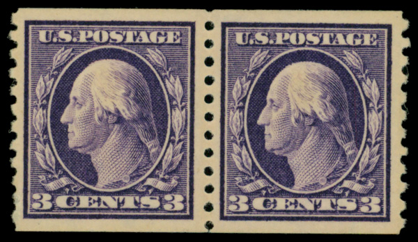 5120 nh 445 image1914, 3¢ violet, type I, S.L. watermark, flat plate coil, perf. 10 vertically (Scott 445), pair, o.g., never hinged; perf thins LL, Extremely Fine.