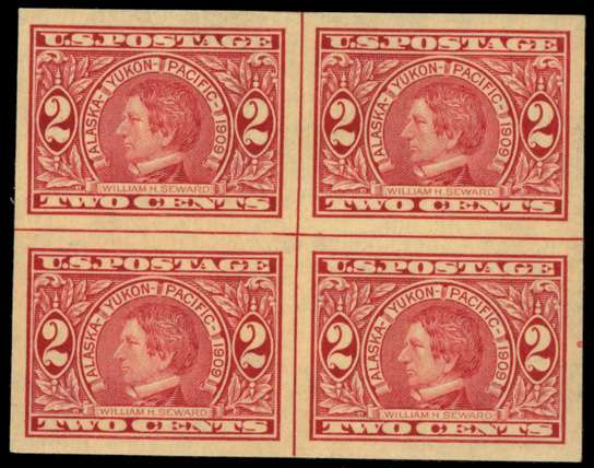 5100 ogbl 371 image1909, 2¢ Alaska-Yukon, imperf. (Scott 371), centerline block of 4, o.g., very lightly hinged, Extremely Fine.
