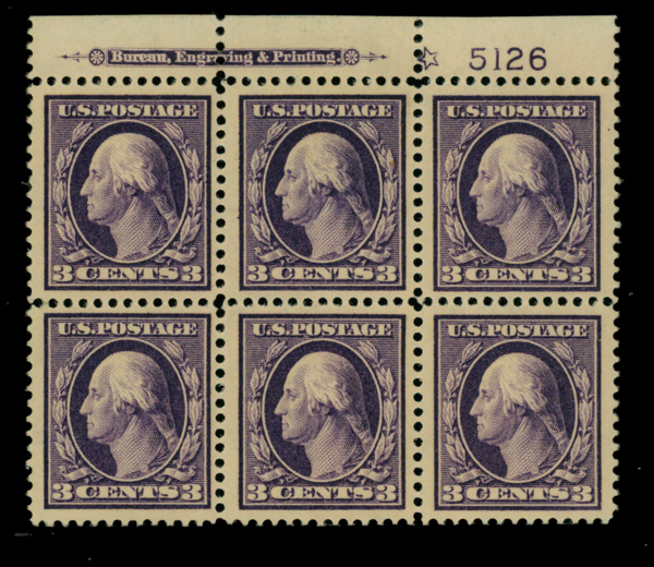 5090 ogbl 333 image1908, 3¢ deep violet, type I, D.L. watermark (Scott 333), plate block of 6 with star, o.g., lightly hinged, Very Fine to Extremely Fine.