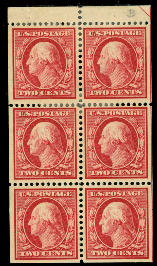 5105 BKog 375a image1910, 2¢ carmine, S.L. watermark, booklet pane of 6 (Scott 375a), position B, o.g., hinge remnants, Very Fine to Extremely Fine.