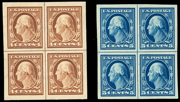 5091 ogbl 343-347 image1908, Washington-Franklins, D.L. watermark, imperf., 1¢ to 5¢ complete (Scott 343-347), centerline blocks of 4, o.g., hinged, Very Fine to Extremely Fine.