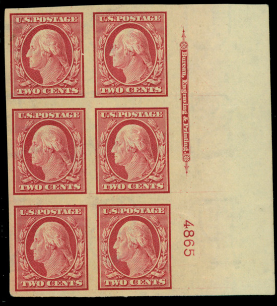 5092 ogbl 344 image1908, 2¢ carmine, D.L. watermark, imperf. (Scott 344), plate block of 6, o.g., lightly hinged, Very Fine to Extremely Fine.