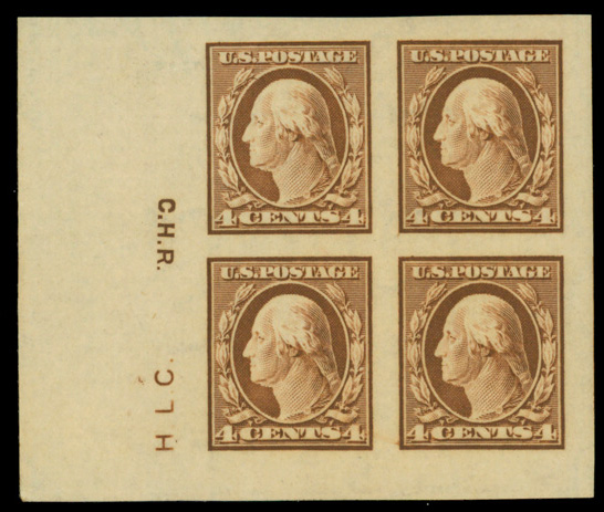 5094 ogbl 346 image1909, 4¢ orange brown, D.L. watermark, imperf. (Scott 346), corner margin block of 4 with siderographer's initials, o.g., lightly hinged, Superb.