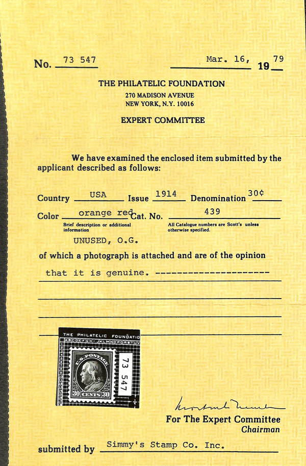 5118 og 439 image1914, 30¢ orange red, S.L. watermark, perf. 10 (Scott 439), o.g., lightly hinged, Very Fine, with 1979 P.F. certificate.
