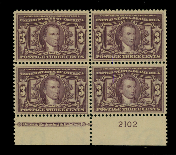 5089 ogbl 325 image1904, 3¢ Louisiana Purchase (Scott 325), plate block of 4, Fine to Very Fine.